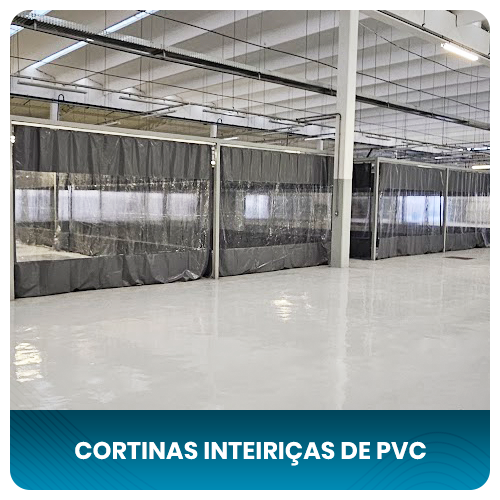 Tiras flexíveis de PVC, transparentes ou coloridas, fixadas em suportes metálicos. Instalação rápida em portas, passagens e divisórias.